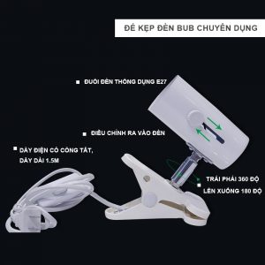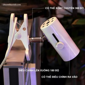 Đế bóng đèn có thiết kế kẹp nên thích hợp kẹp vào ban công, thành kính hồ thủy sinh,hồ bán cạn… thao tác dễ dàng và rất thuận tiện. Góc quay của đế đèn là 360 độ, góc lên xuống là 180 độ cho nên việc thao tác chỉnh sửa vị trí bóng đèn cho phù hợp vô cùng thuận tiện.